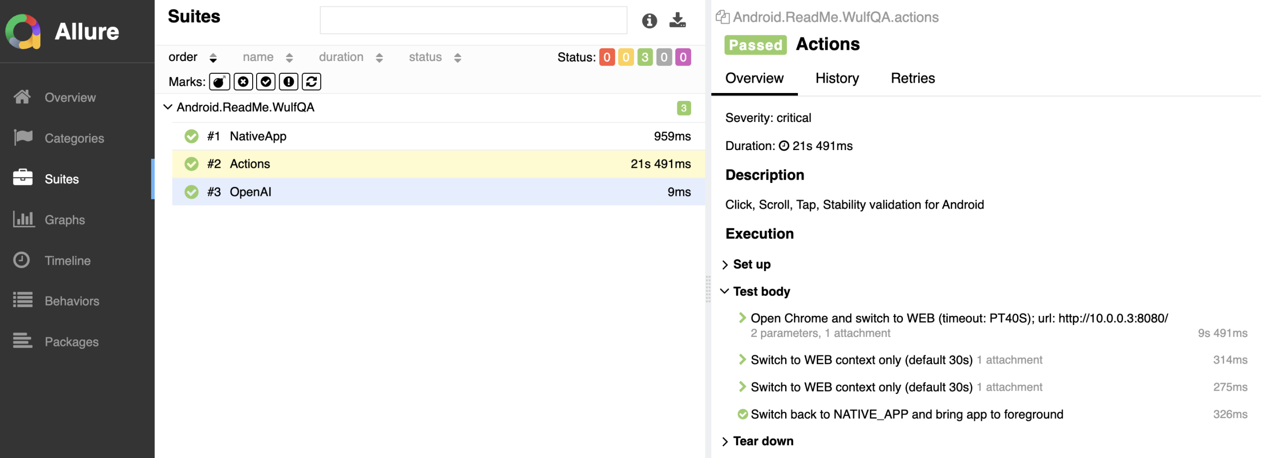 Allure הוא כלי דוחות שמציג בצורה יפה את תוצאות הטסטים: סטטוסים, צעדים, צילומי מסך/קבצים מצורפים, תיאורים, וחומרה (Severity).
