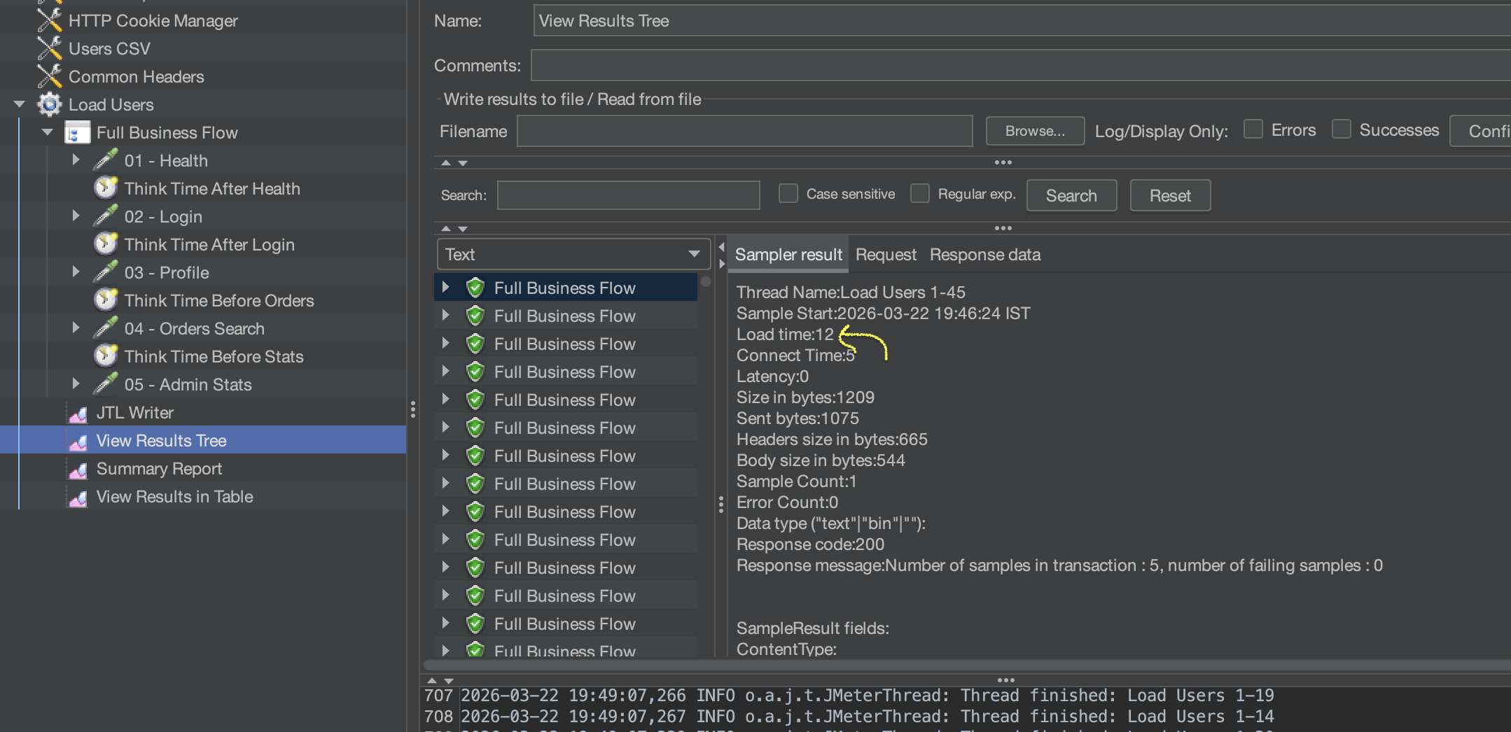 אחד הדברים החדשים באמת ב-02_load הוא Transaction Controller בשם Full Business Flow. הרעיון שלו פשוט אבל חשוב: לא למדוד רק כל בקשה בנפרד, אלא גם את כל הזרימה העסקית מקצה לקצה.