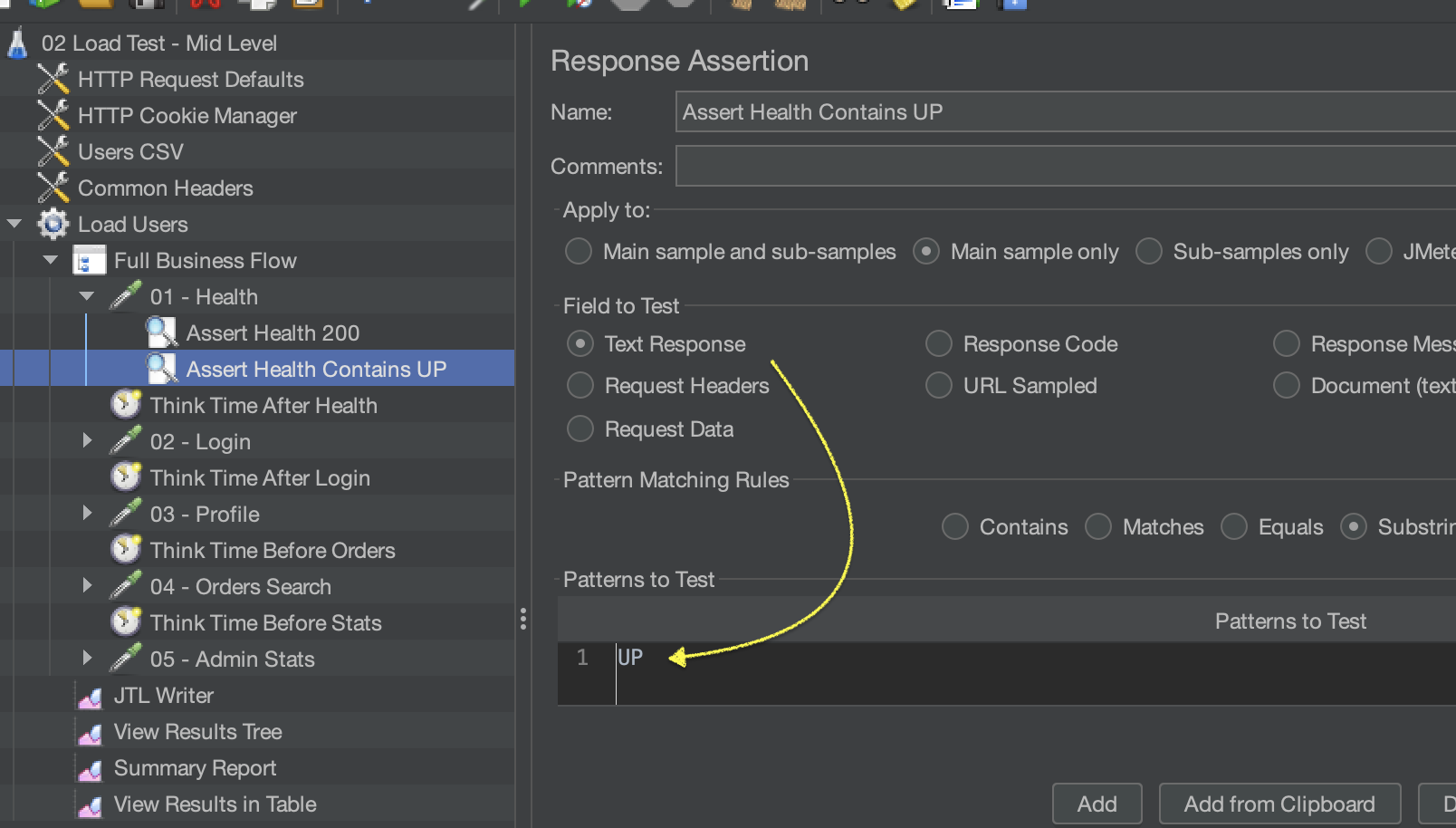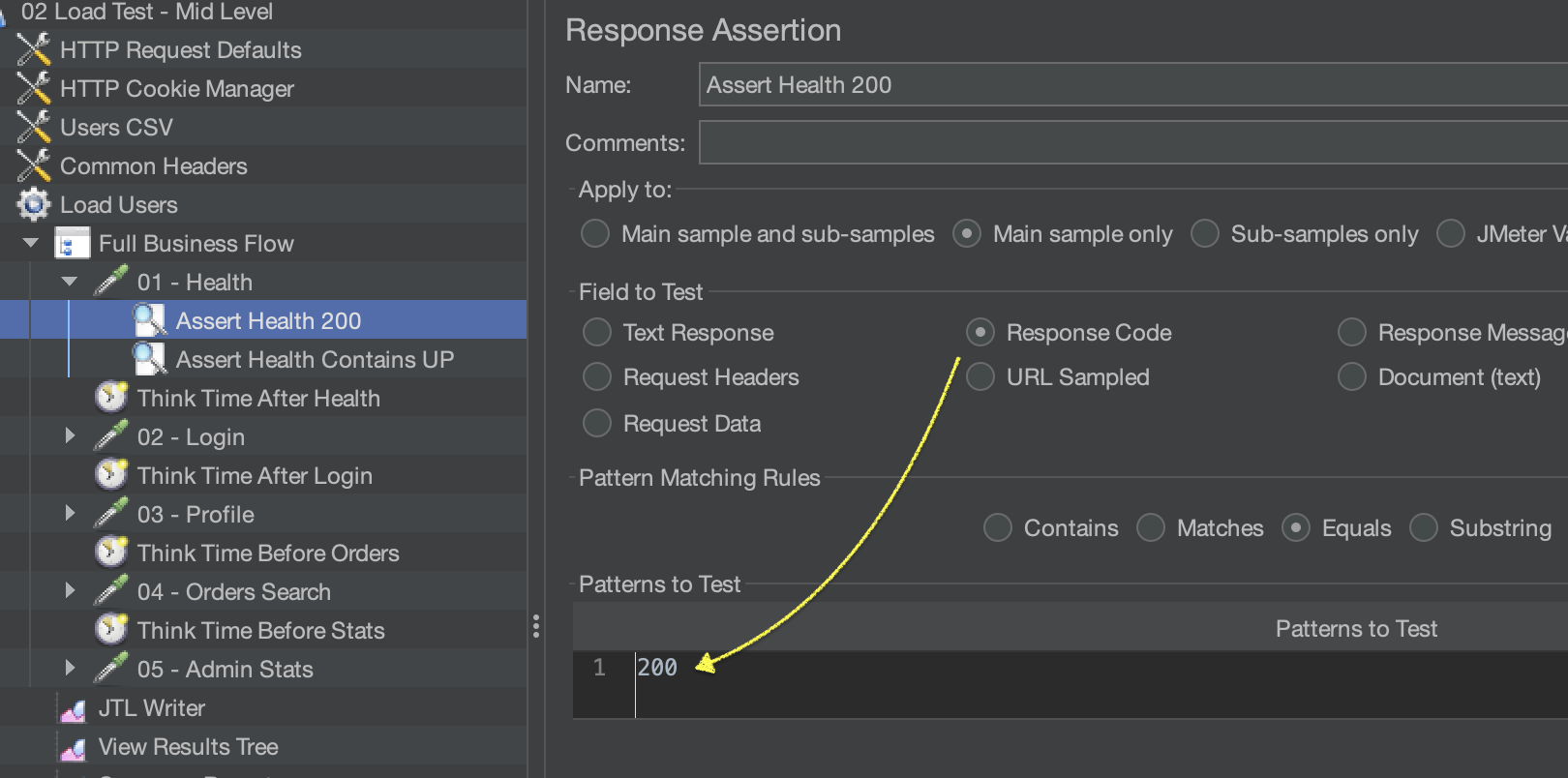 ב-01_smoke מספיק לפעמים לבדוק שהתקבל HTTP 200. ב-02_load זה כבר לא מספיק, כי תגובה יכולה לחזור עם 200 ובכל זאת להיות שגויה, ריקה או חלקית.