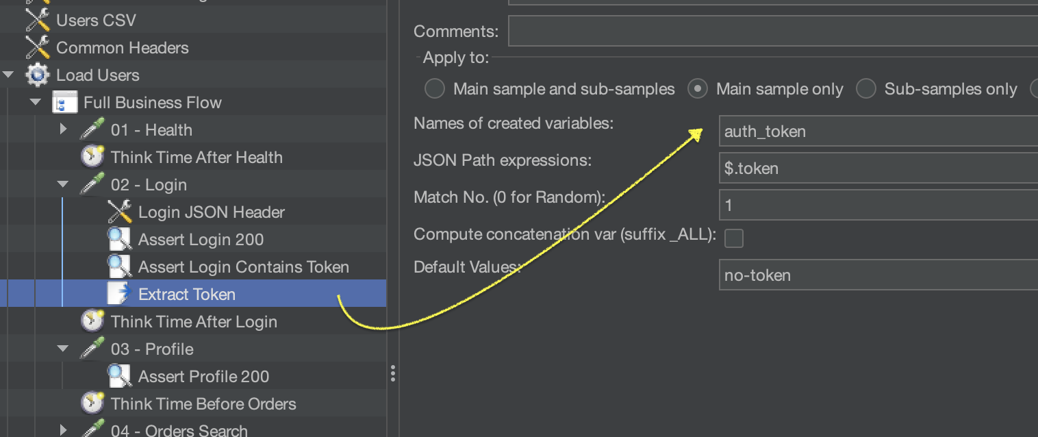 במאמר הקודם כבר הוסבר איך מחלצים ערך מ-JSON. ב-02_load החילוץ הזה הופך לחלק מעשי מהזרימה העסקית: אחרי Login מחלצים את ה-token, ואז משתמשים בו בבקשות הבאות.